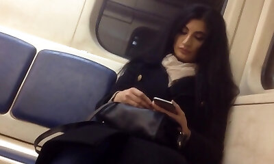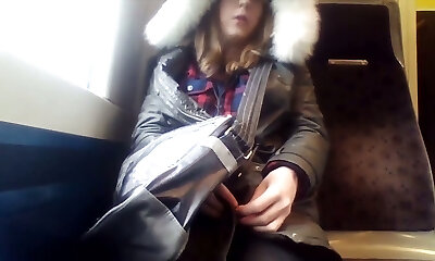 развратная девушка в футболке любит показывать свои интимные места в общественном транспорте